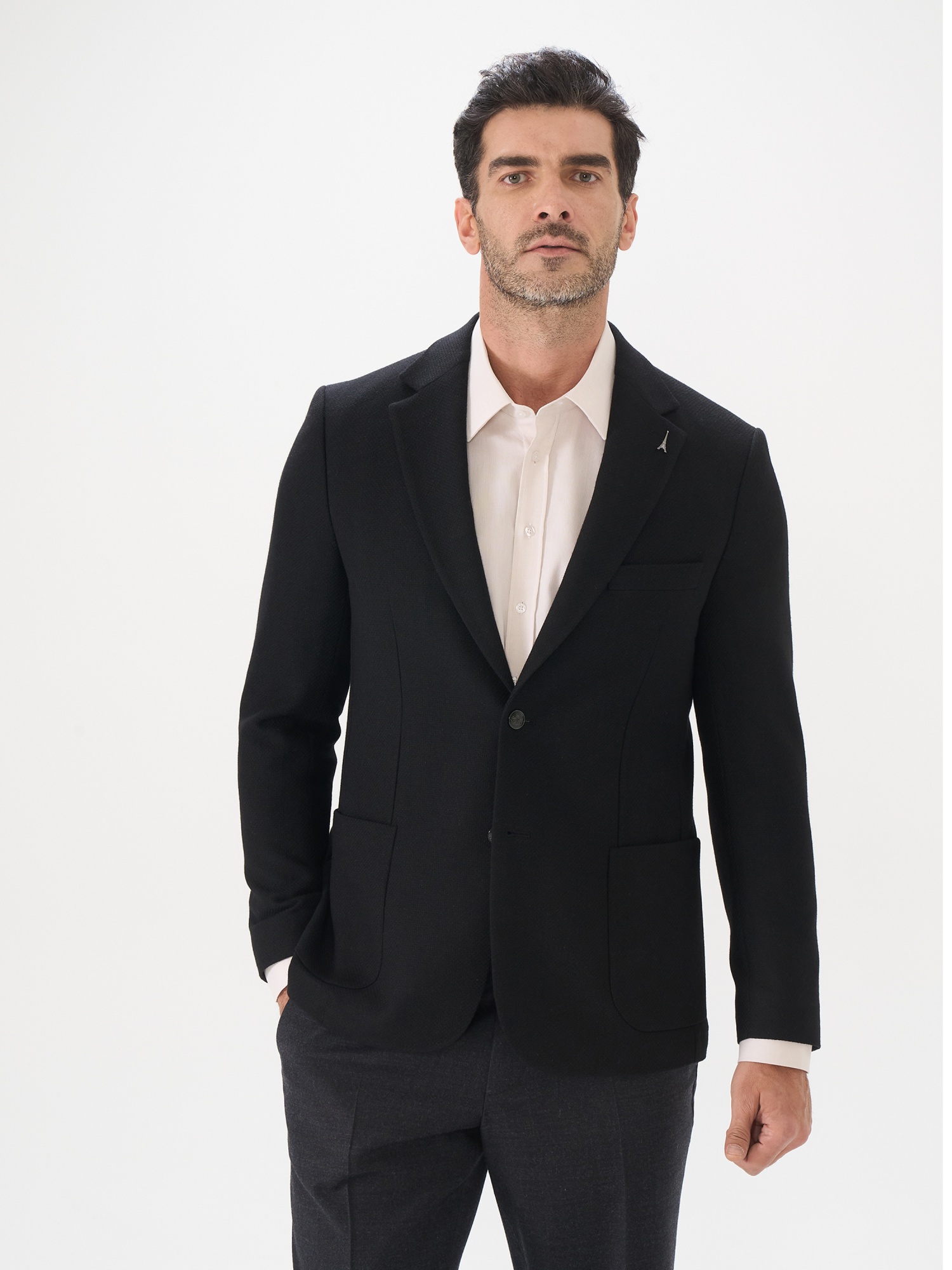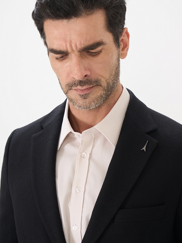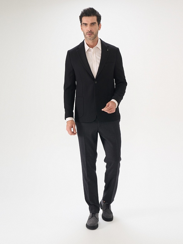 Мужской однобортный пиджак Cacharel — из качественной смесовой шерсти, которая обеспечивает комфорт. Приталенный крой подчёркивает силуэт. Пиджак с накладными карманами, нагрудным карманом.