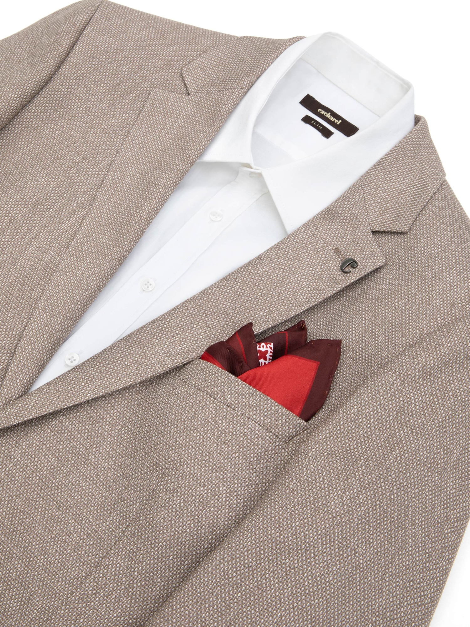 Платок нагрудный с узором Cacharel — комбинированный рисунок сочетает геометрические элементы и орнаментальные мотивы, создавая выразительный визуальный акцент.