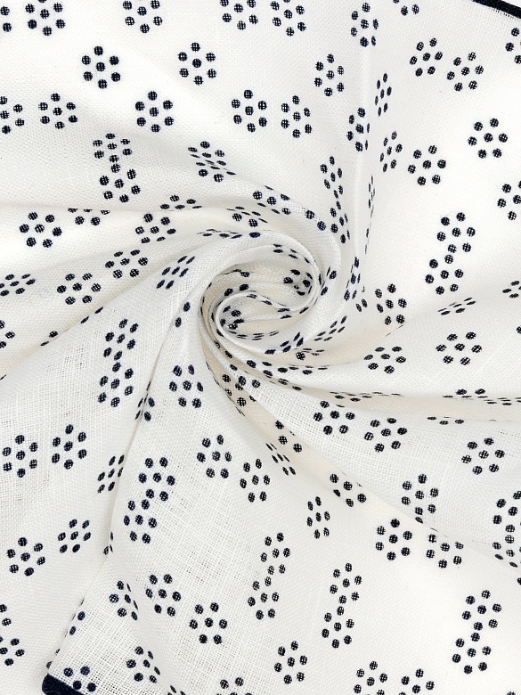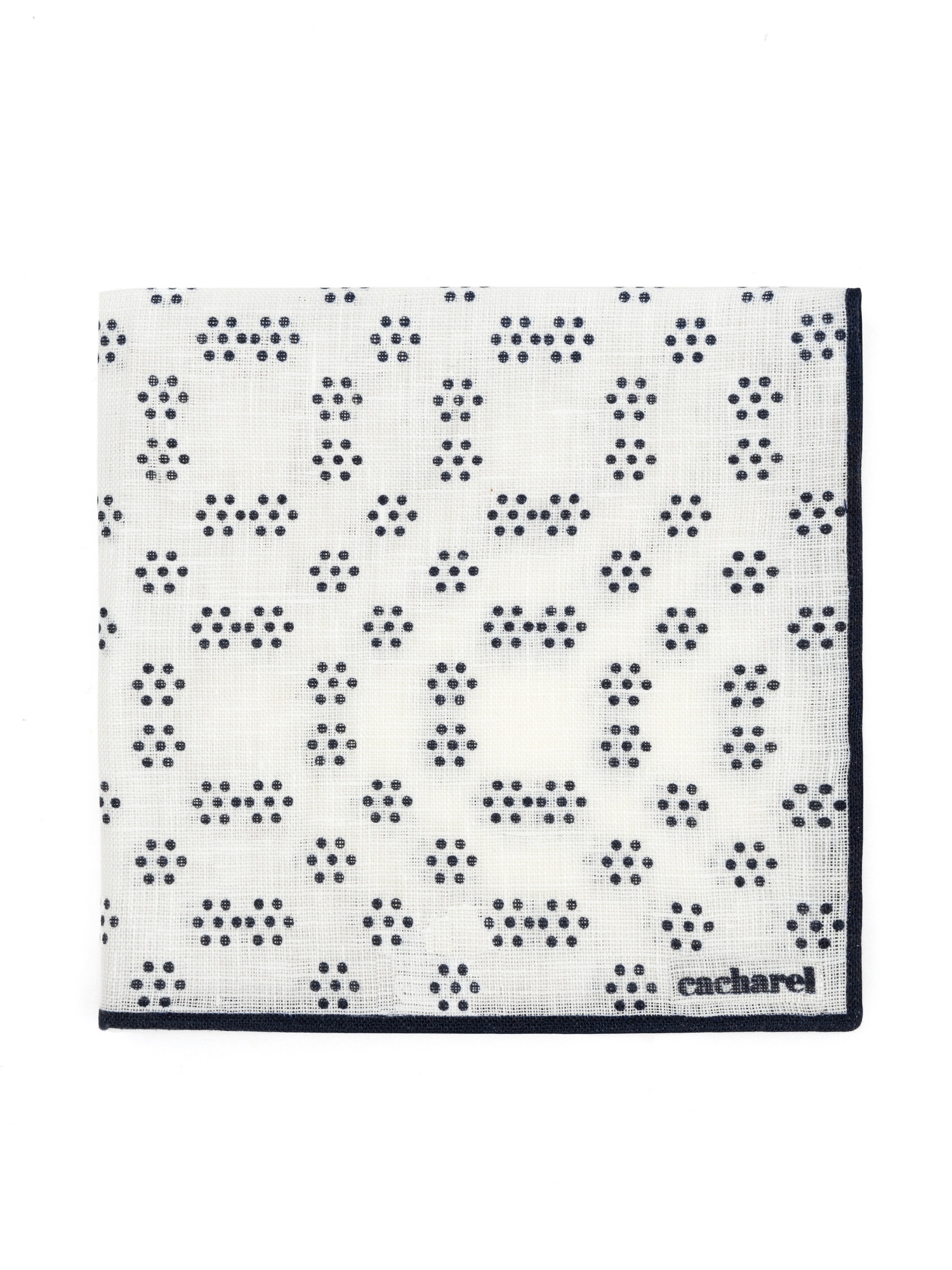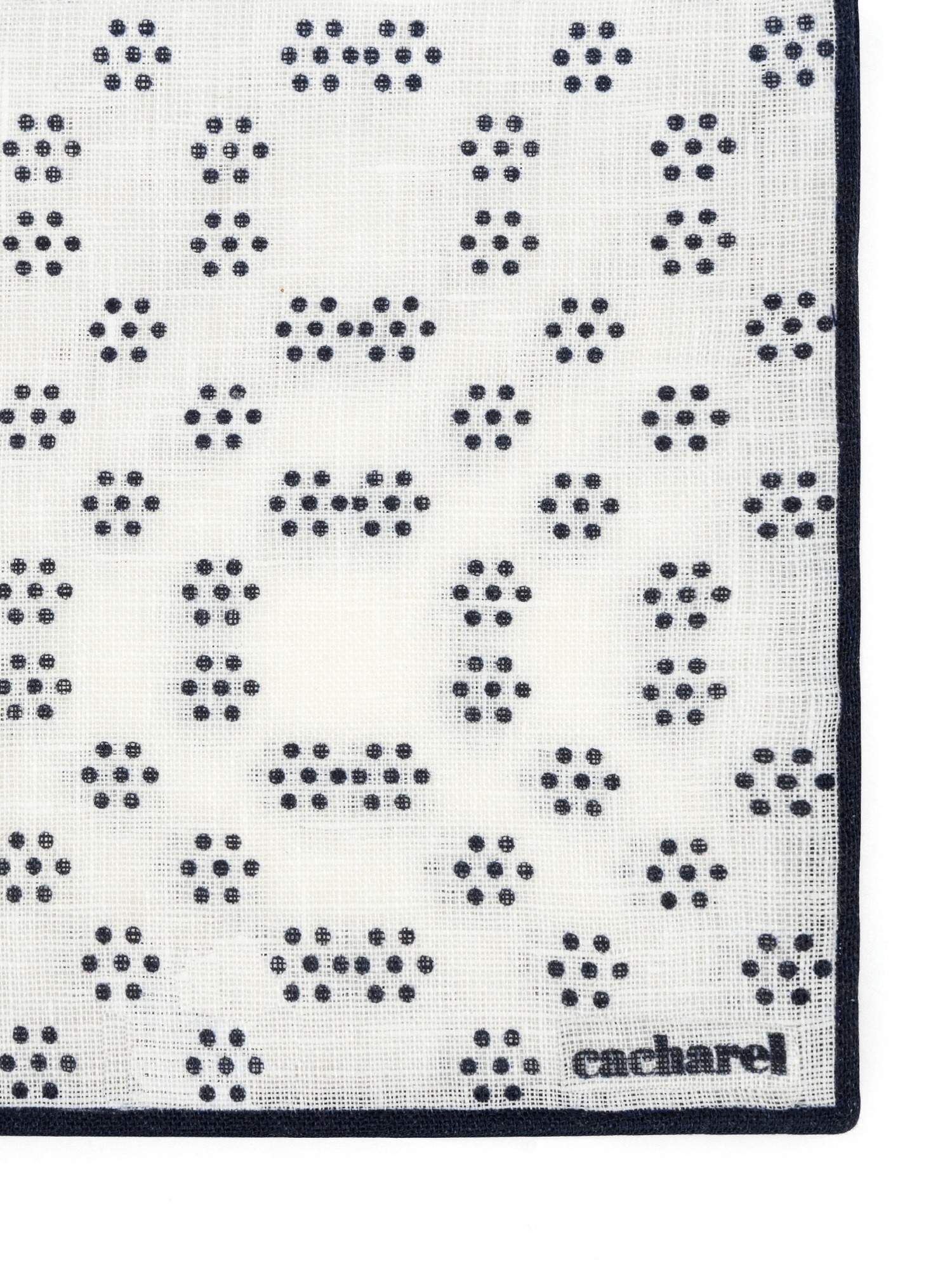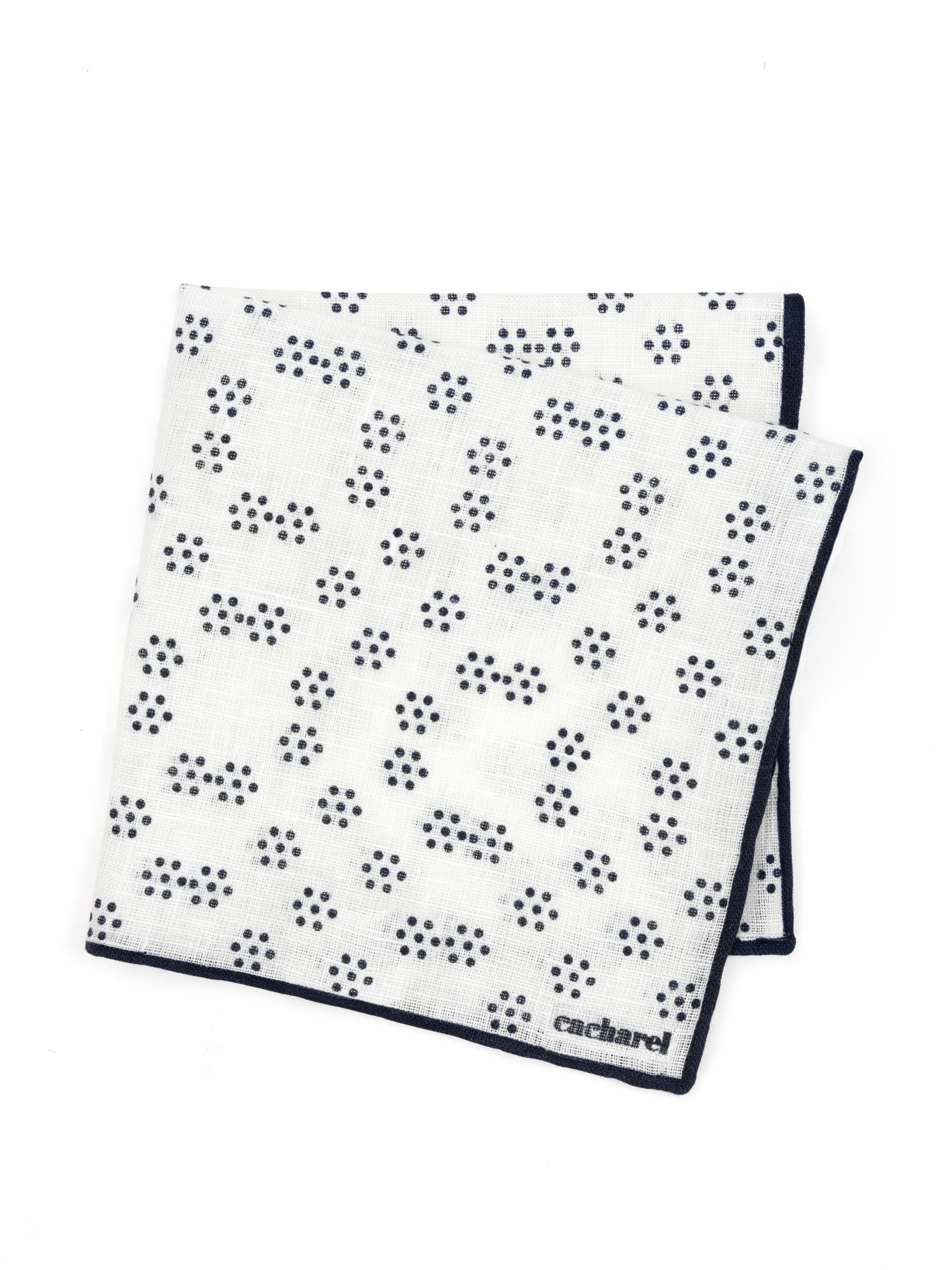 Платок нагрудный льняной с узором Cacharel — аксессуар для классических и деловых образов. Изготовлен из натурального льна. Дизайн оформлен мелким геометрическим узором в виде точек, равномерно распределённых по поверхности, и дополнен контрастной окантовкой по краю.