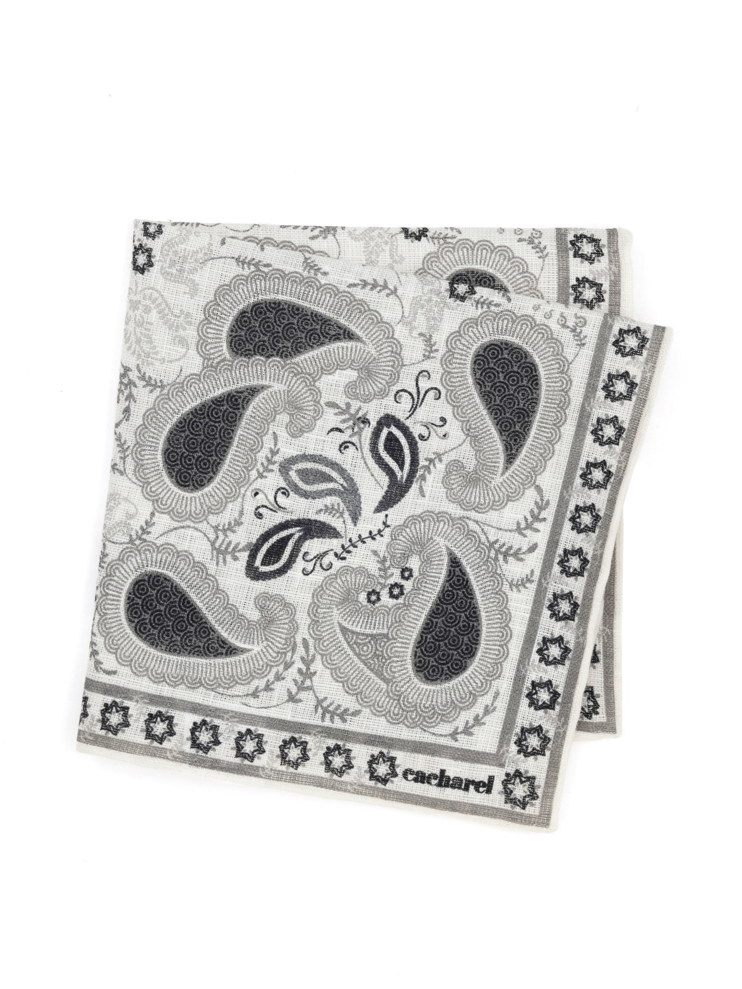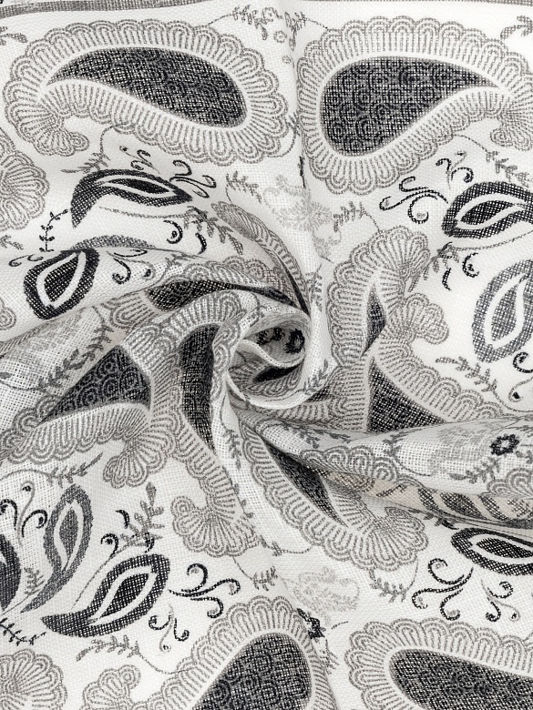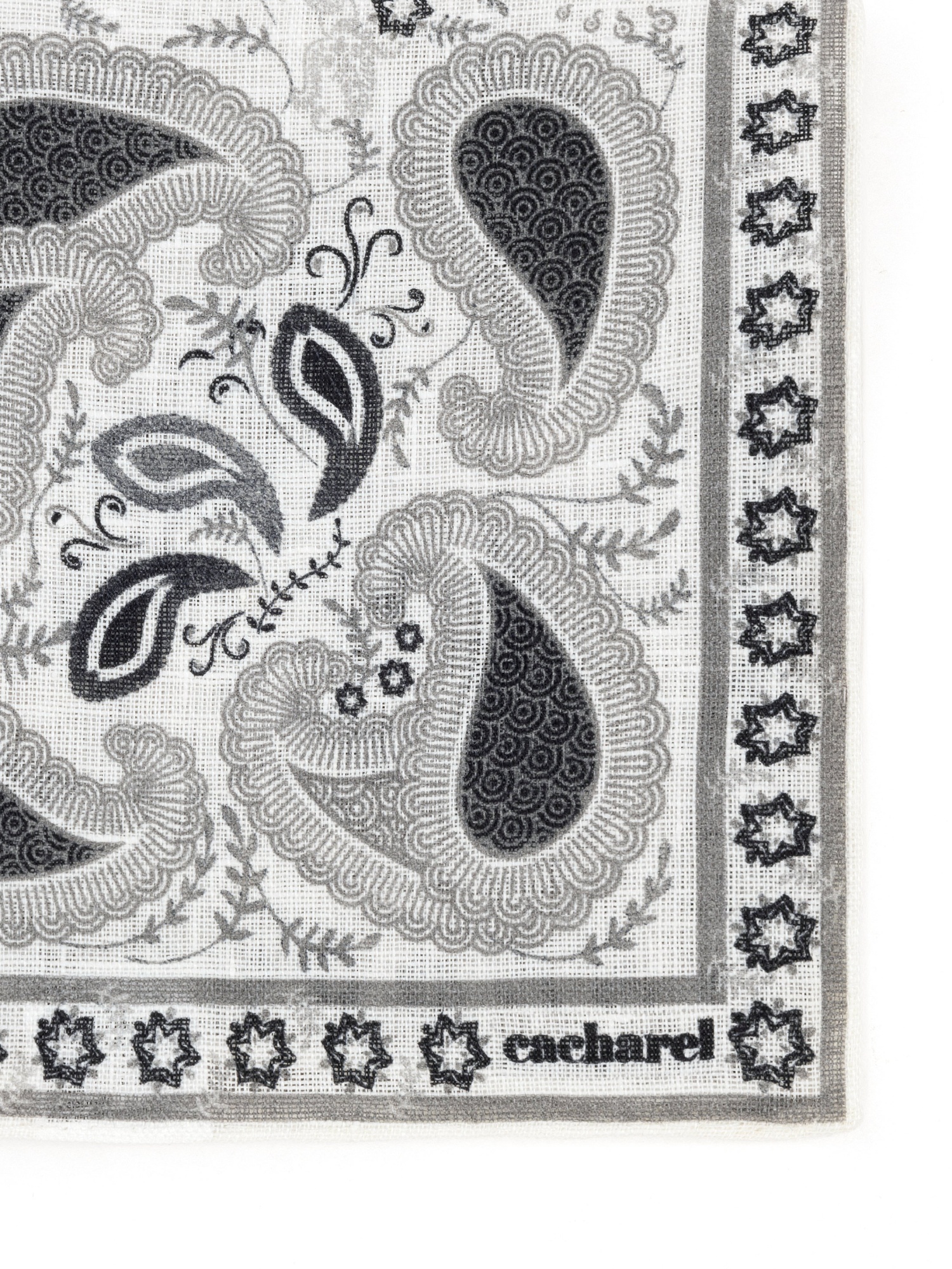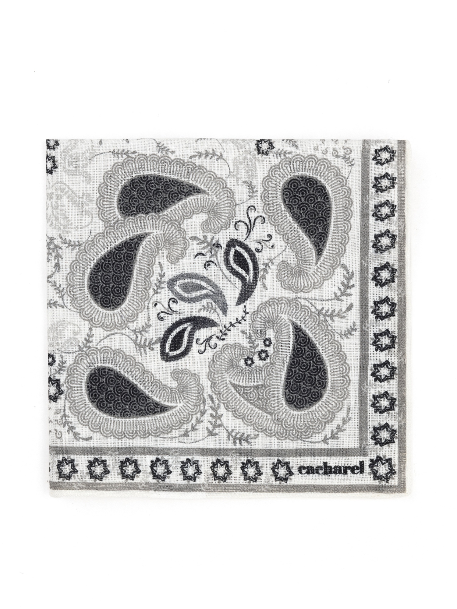 Платок нагрудный льняной с узором Cacharel — аксессуар для классических и деловых образов. Изготовлен из натурального льна. Дизайн оформлен декоративным узором пейсли с растительными элементами, дополненным орнаментальной рамкой по краю.