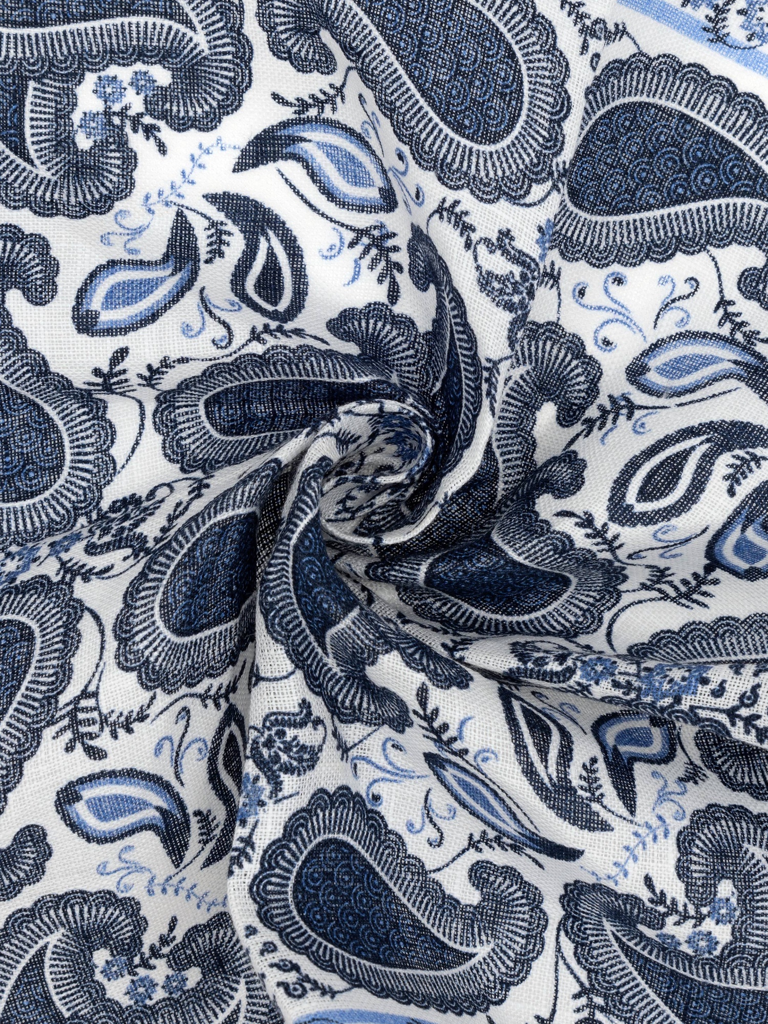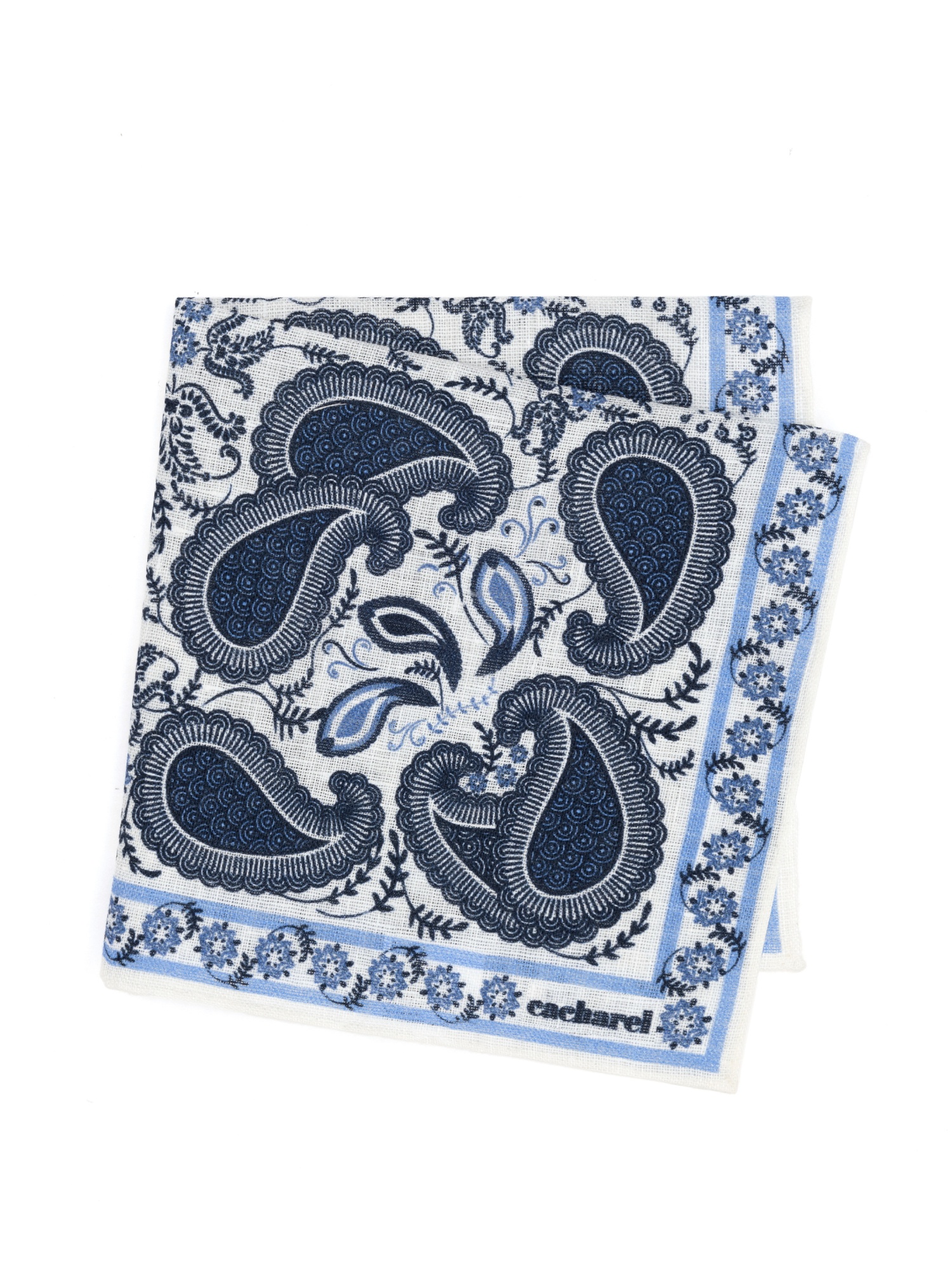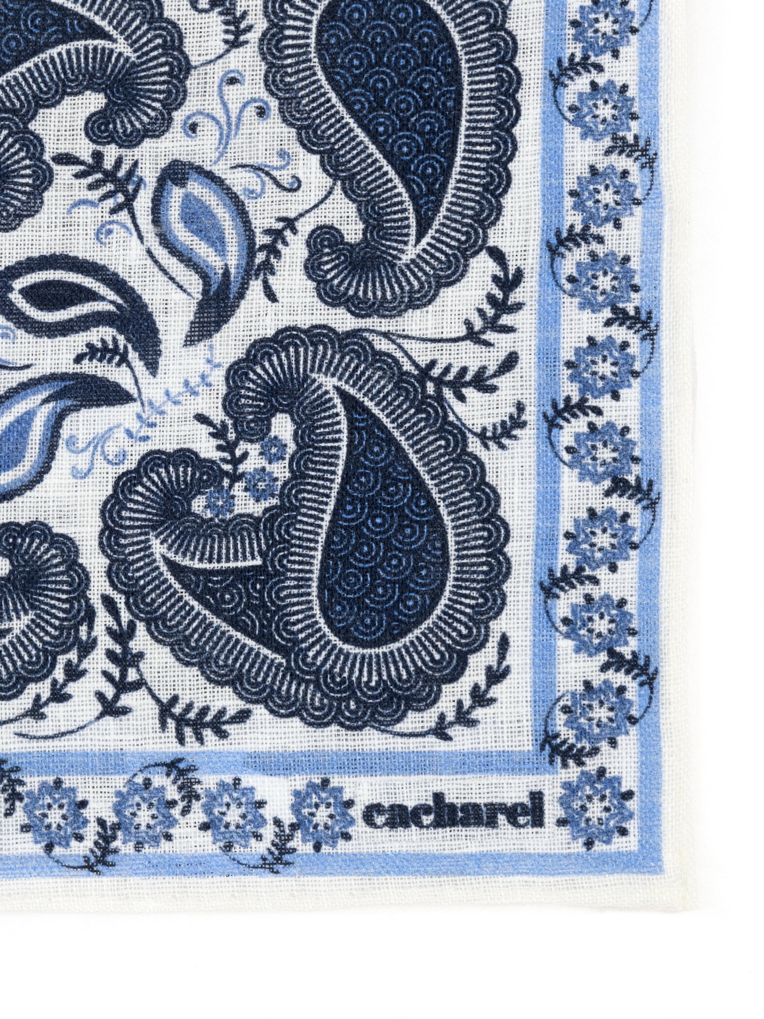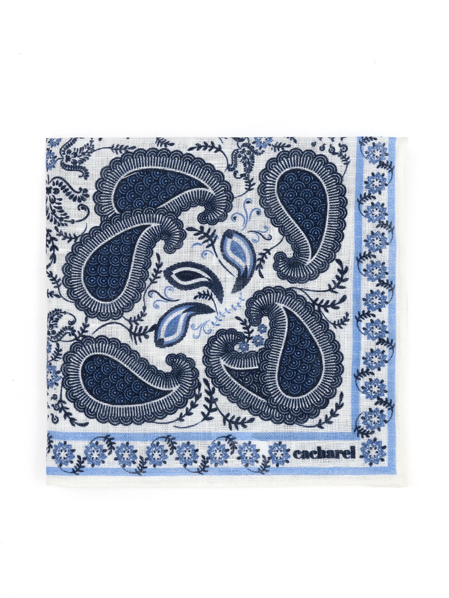 Платок нагрудный льняной с узором Cacharel — аксессуар для классических и деловых образов. Изготовлен из натурального льна. Дизайн оформлен декоративным узором пейсли с растительными элементами, дополненным орнаментальной рамкой по краю.