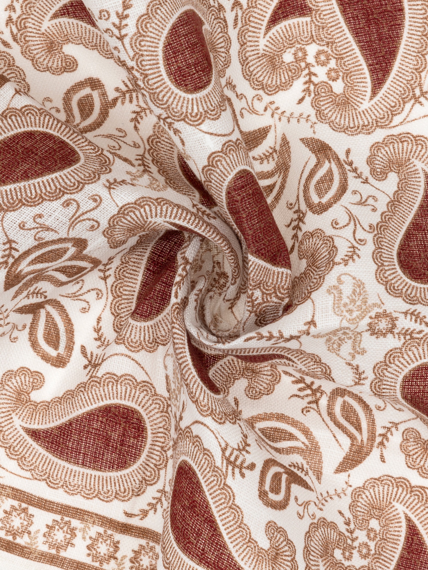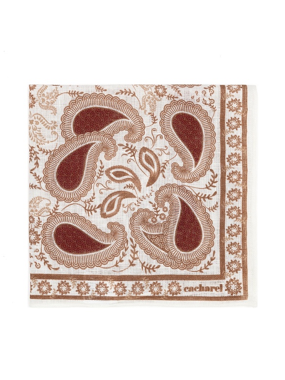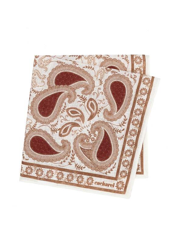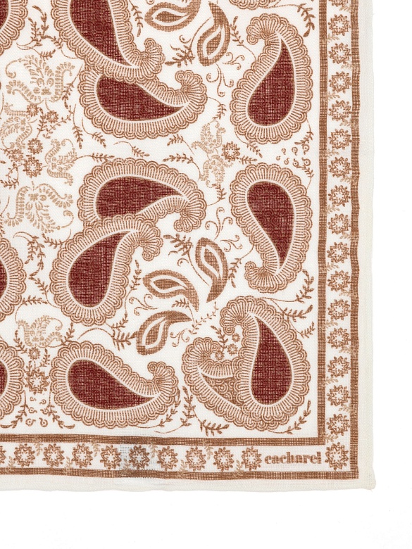 Платок нагрудный льняной с узором Cacharel — аксессуар для классических и деловых образов. Изготовлен из натурального льна. Дизайн оформлен декоративным узором пейсли с растительными элементами, дополненным орнаментальной рамкой по краю.