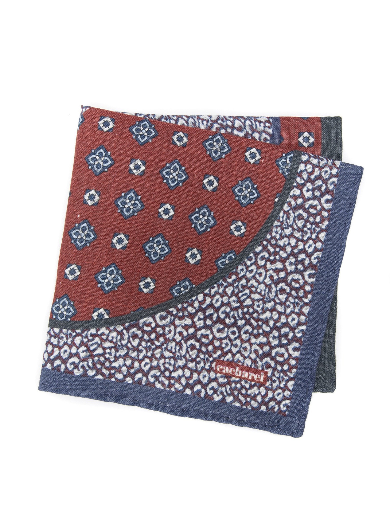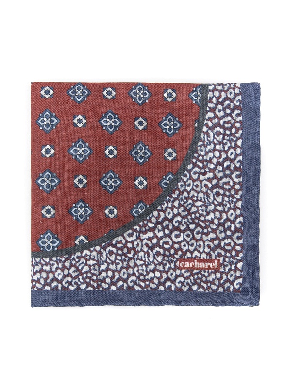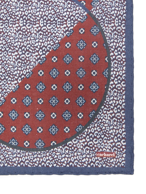 Платок нагрудный льняной с узором Cacharel — аксессуар для классических и деловых образов. Изготовлен из натурального льна. Дизайн выполнен в комбинированном стиле: геометрический орнамент с мелкими мотивами дополнен контрастным узором по краю.