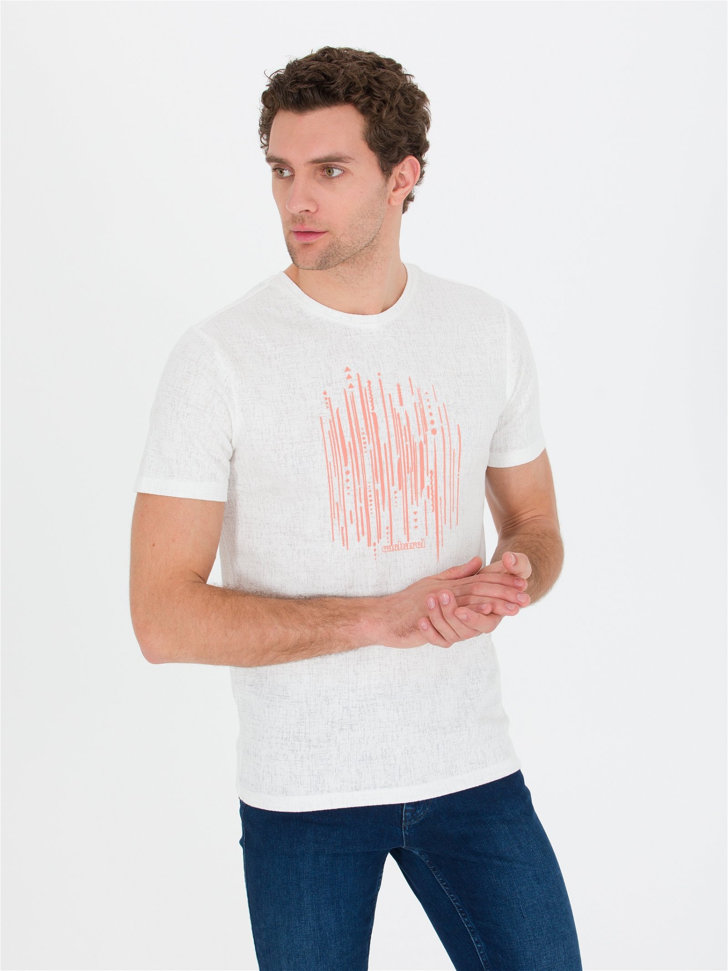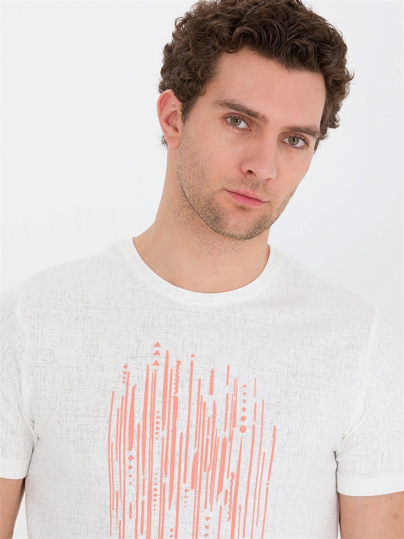 Футболка с принтом на груди, который добавляет образу выразительный акцент. Материал отличается мелкой фактурной поверхностью, придающей ткани визуальную глубину и аккуратный внешний вид.