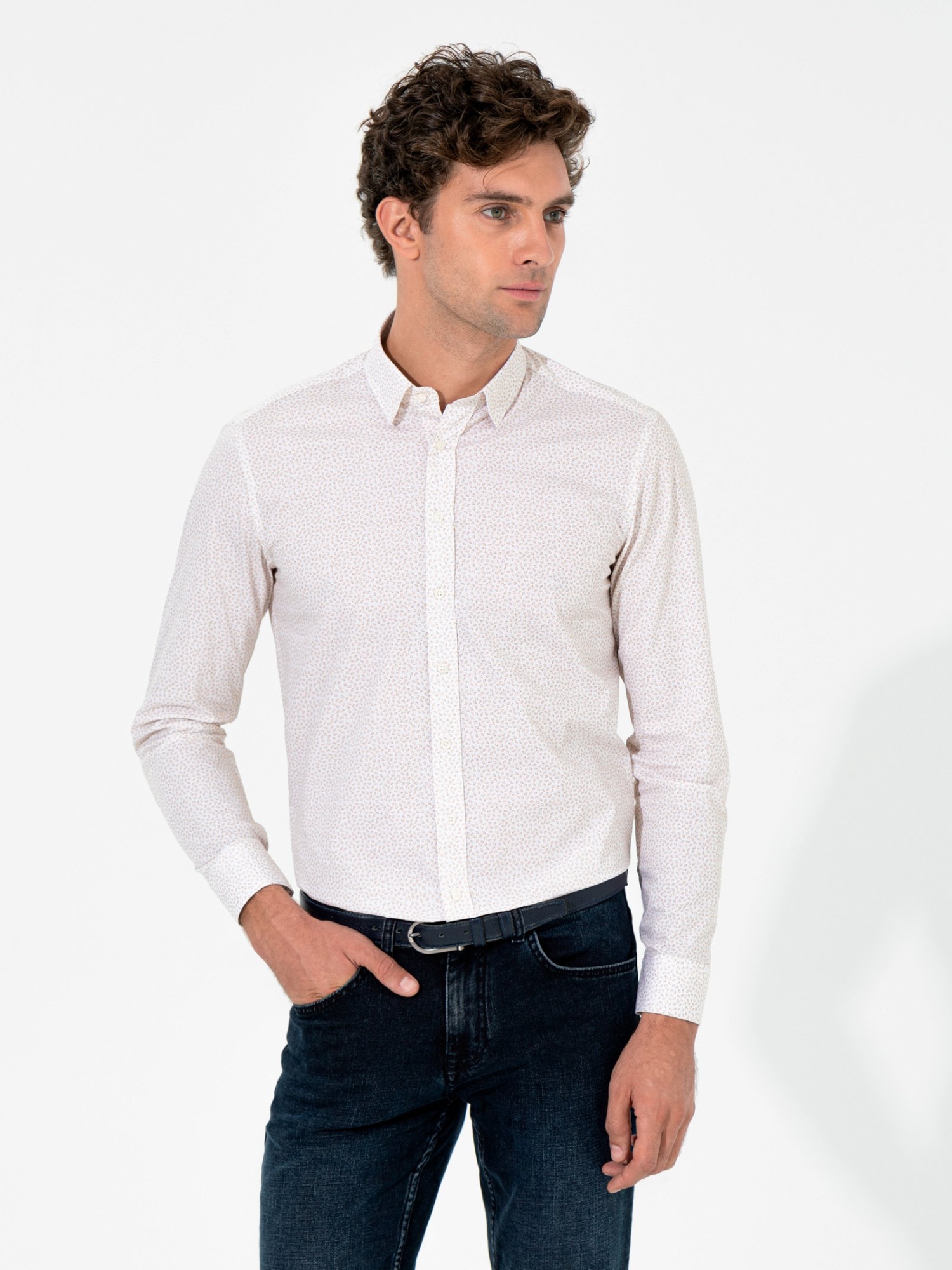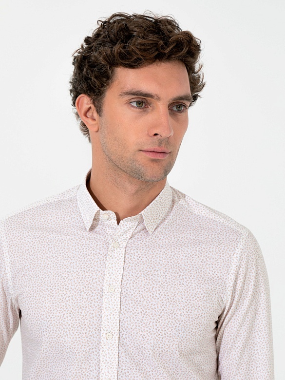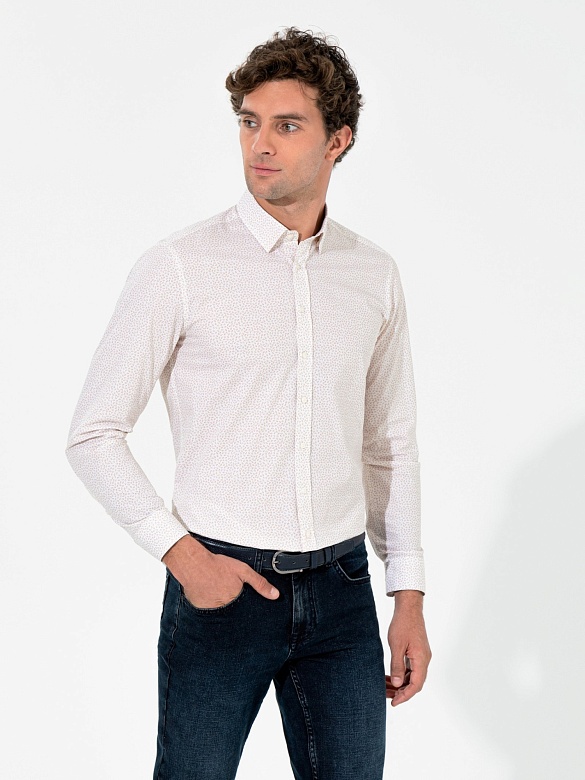 Рубашка Cacharel — с узором, приталенного кроя. Узор создан, для создания стильного и запоминающегося образа, сочетающего в себе классический крой и выразительный узор. Она обеспечит вам комфорт и элегантный внешний вид в течение всего дня. Рубашка с воротником на пуговицах, который фиксирует форму и сохраняет опрятный вид.