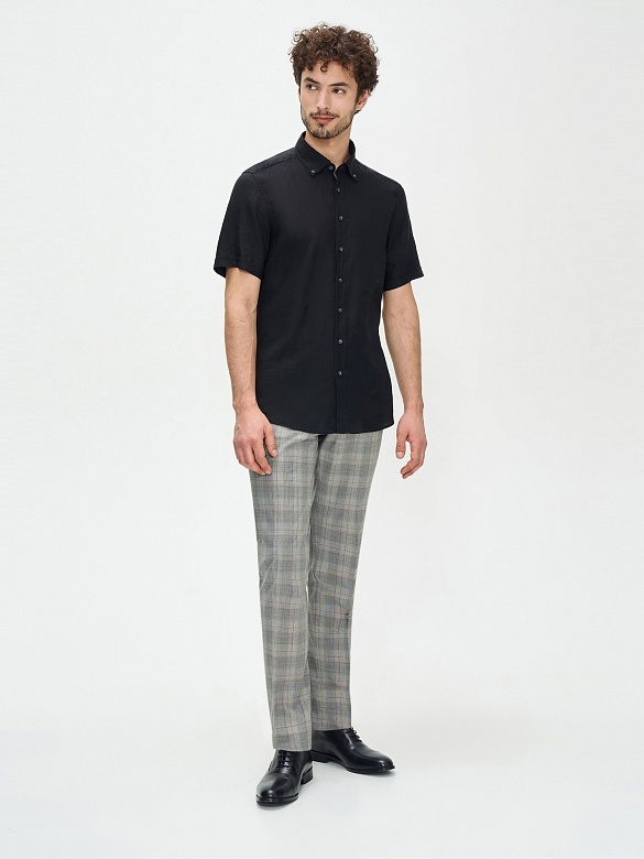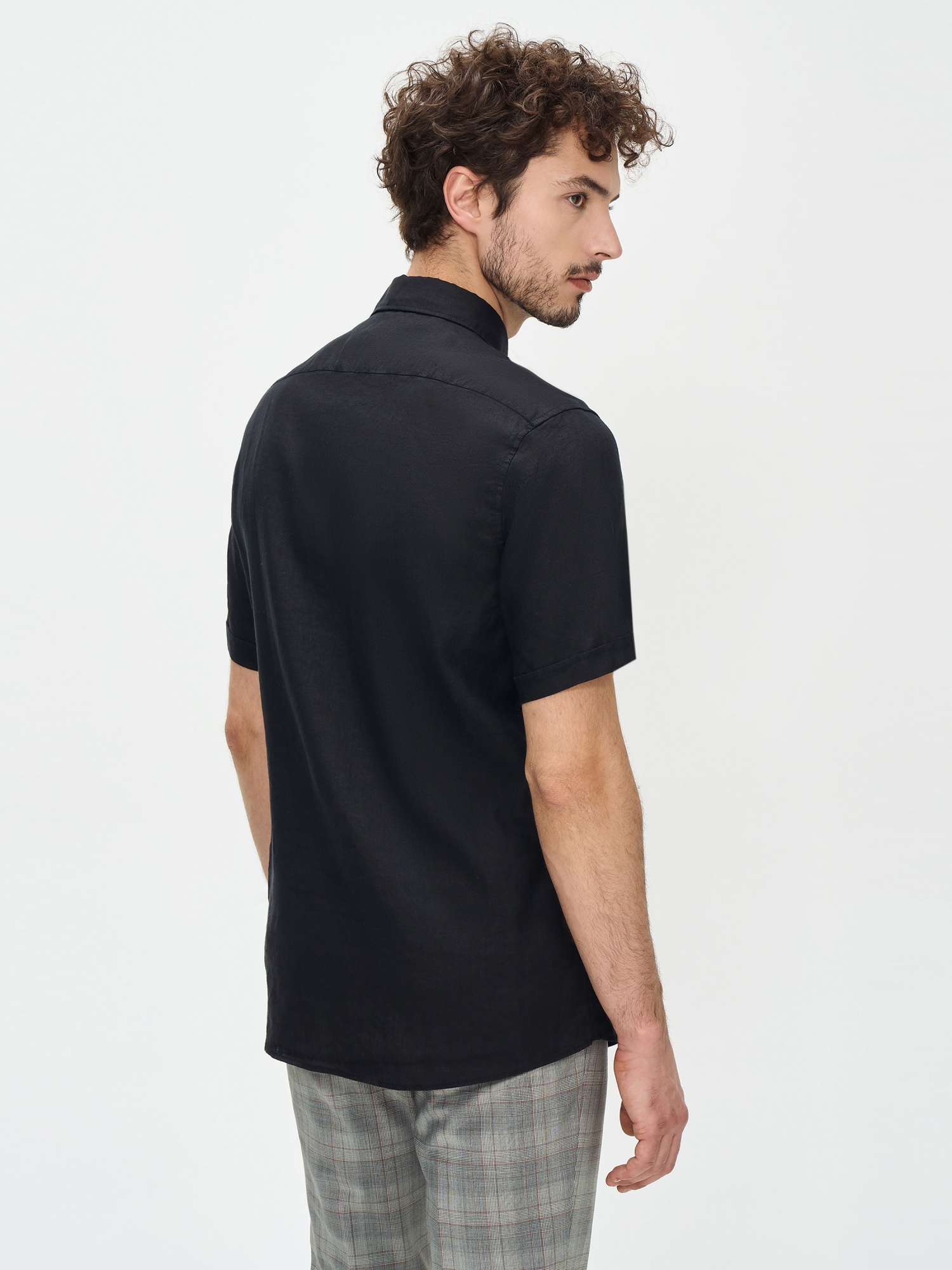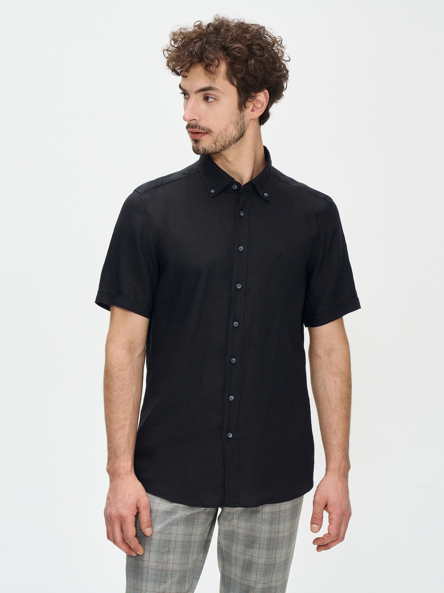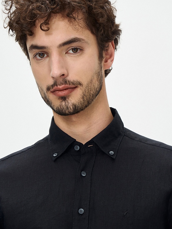 Льняная рубашка Cacharel с коротким рукавом — приталенная модель из натуральной ткани. Лён делает материал лёгким и приятным к телу, хорошо подходящим для тёплого сезона. Воротник на пуговицах помогает сохранять форму. Приталенный крой формирует аккуратную посадку, короткий рукав добавляет образу непринуждённость.