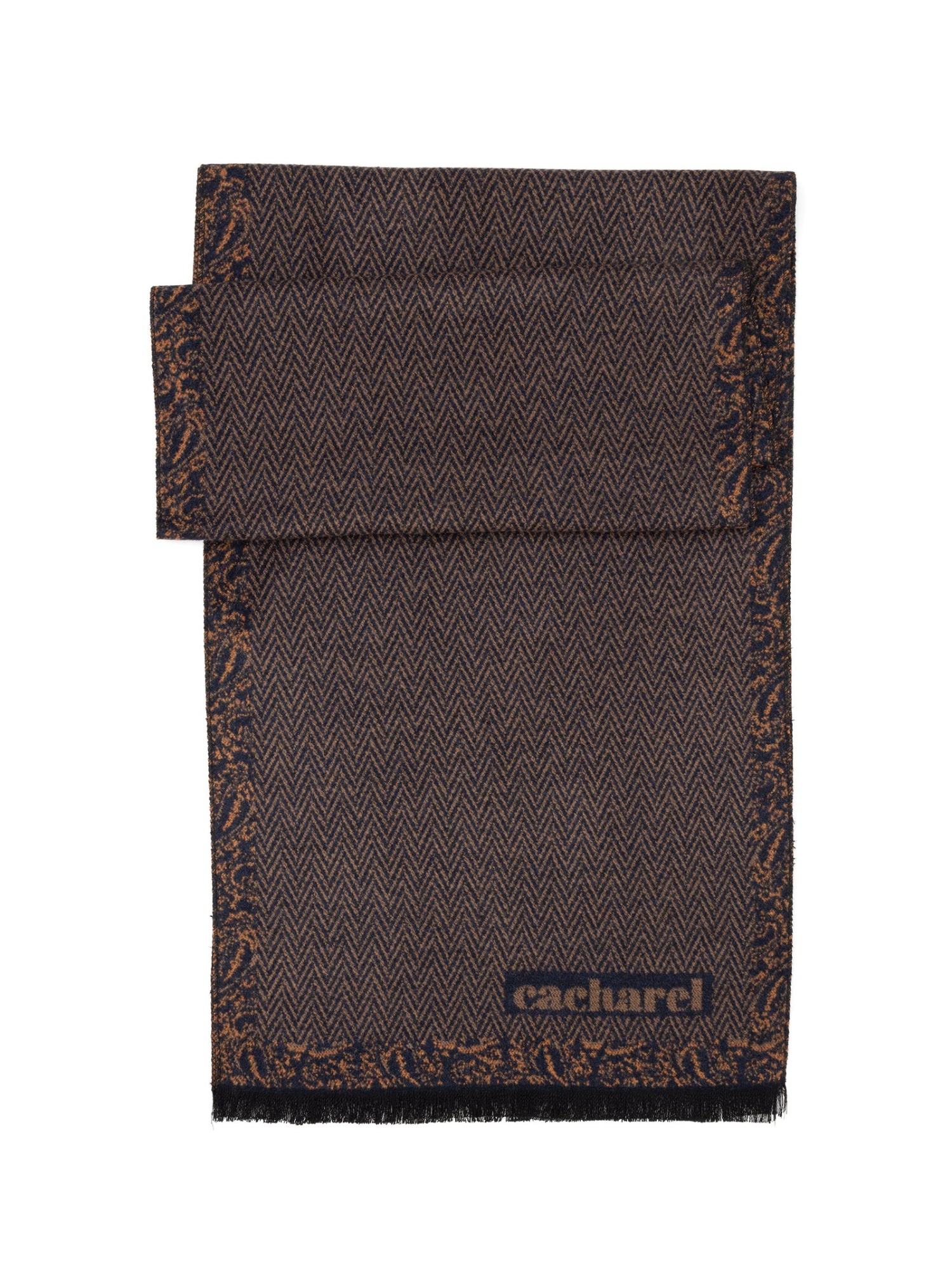 Шарф из вискозы с геометрическим узором Cacharel — с геометрическим рисунком, выстроенным в чёткий ритмичный орнамент. Окантовка по краям подчёркивает форму изделия. Узор формирует выразительный внешний вид изделия.