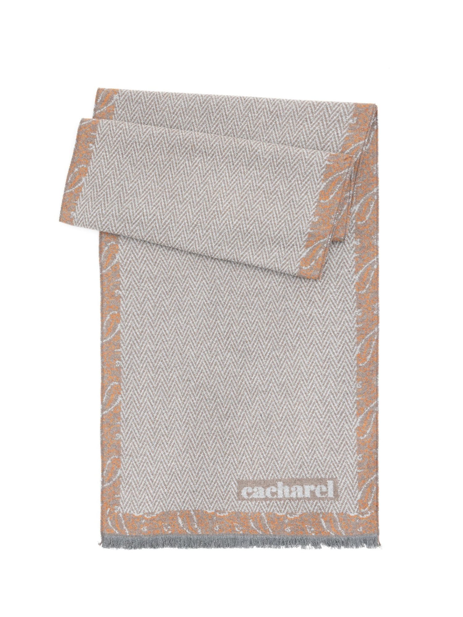 Шарф из вискозы с геометрическим узором Cacharel — с геометрическим рисунком, выстроенным в чёткий ритмичный орнамент. Окантовка по краям подчёркивает форму изделия. Узор формирует выразительный внешний вид изделия.
